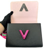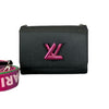 This is an authentic Louis Vuitton Twist PM Shoulder Epi in Black and Pink. This stylish shoulder bag is made of textured epi leather in black. The bag has a black matte shoulder strap with a leather pad and a pink LV twist lock on the front flap. Inside, there's a pink microfiber interior with flat pockets.