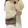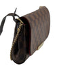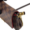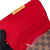 This stylish bag is finely crafted of signature Louis Vuitton Damier canvas in medium size. The bag features dark chocolate brown strap, a gold tone short strap, and polished brass hardware. The top flap opens to a rouge red microfiber interior.