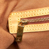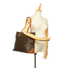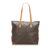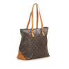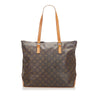 The Cabas Mezzo features a monogram canvas body, flat leather straps, a top zip closure, and interior zip and slip pockets.