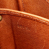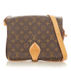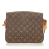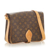 This Louis Vuitton Cartouchiere GM features a monogram canvas body, an adjustable flat leather strap, a front flap with buckle closure, and an interior slip pocket.