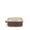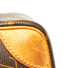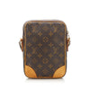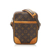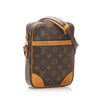 The Louis Vuitton Danube features a monogram canvas body, an adjustable shoulder strap with leather details, an exterior front slip pocket, and a top zip closure.