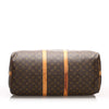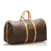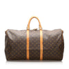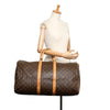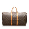 The Louis Vuitton Keepall Bandouliere 55 features a monogram canvas body, rolled leather handles, a detachable shoulder strap, and a top zip closure.