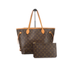 The Louis Vuitton Neverfull MM features a monogram canvas body, flat leather handles, and an interior zip pouch.