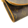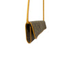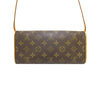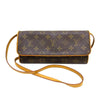 This Louis Vuitton Pochette Twin GM features a monogram canvas body, a flat leather strap, a front flap with a magnetic closure, and an interior slip pocket.