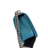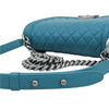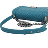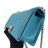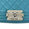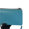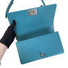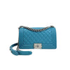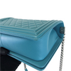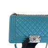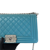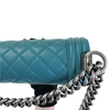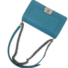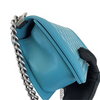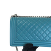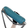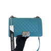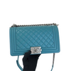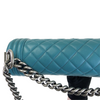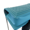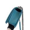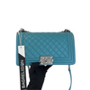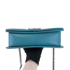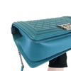 This Chanel Old Medium Boy Bag is crafted in gorgeous teal lambskin leather. It features a chain shoulder strap with a leather shoulder pad and the iconic Boy CC closure. This is a great statement piece for any OOTD and a one-of-a-kind addition to your collection.