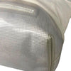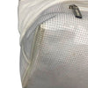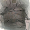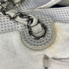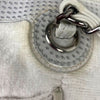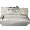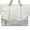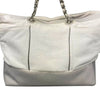 Chanel CC Cotton Tote Bag White. This tote bag features a cotton body with leather trim, silver-tone chain straps, an open top, and interior zip pockets.