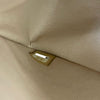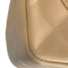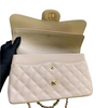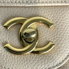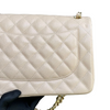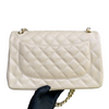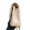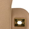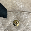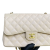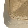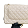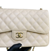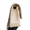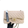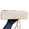 This Chanel Classic Flap is as iconic as a bag can get. It features the durable beige diamond-quilted Caviar Leather adorned with gold hardware. It also features the leather and gold chain link shoulder strap which can be worn long or short. The interior is the perfect size to fit all of your daily needs and essentials with one large compartment and two smaller pockets in the front.