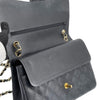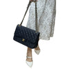 This Chanel Classic Flap is as Iconic as a bag can get. It features the durable black diamond-quilted Caviar Leather adorned with gold hardware. It also features the leather and gold chain link shoulder strap which can be worn long or short. The interior is the perfect size to fit all of your daily needs and essentials with one large compartment and two smaller pockets in the front.