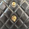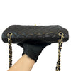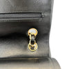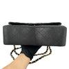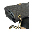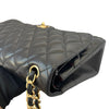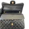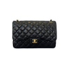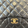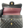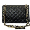 This is an authentic Chanel Jumbo Classic Double Flap Lambskin in Black. This stylish shoulder bag is crafted of caviar textured leather. It features leather straps with shiny gold chain, a back pocket, and a front flap secured by a shiny gold CC turn lock. The flap opens to a second flap and a burgundy leather interior with patch pockets.