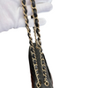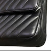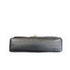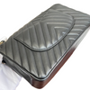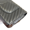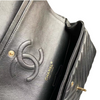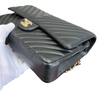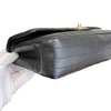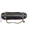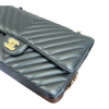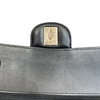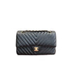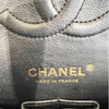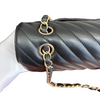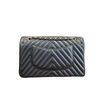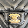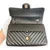 This Chanel Medium Double Flap Chevron bag is made from Calfskin leather in black and features gold chain-link leather-threaded shoulder straps and a front flap with a gold classic CC turn lock. The bag opens to a second flap and a matching leather interior with patch pockets for stylish organized storage.