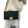 This Chanel Medium Le Boy Bag comes in a classic shade of black and is a staple in any fashionistas wardrobe. Featuring chevron-quilted Calfskin leather with a cc clasp closure in Gold Toned Hardware as well as a chain strap in the same hardware, this classic piece will never go out of style. With more than enough room for all of your essentials, this bag can seamlessly go from daytime business to evening party.