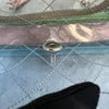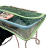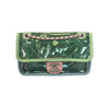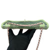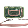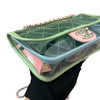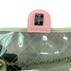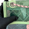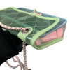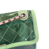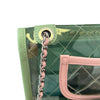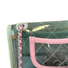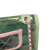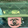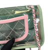 This is an authentic Chanel Coco Splash Flap Lambskin PVC Quilted in Blue, Green and Pink. The bag features chic silver chain shoulder straps intertwined with soft pink leather. It includes a silver Chanel CC turn lock on a pink leather tab for quick access. Inside, there's a roomy interior with a convenient patch pocket.