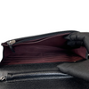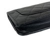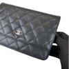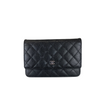 This Chanel Caviar Wallet on Chain features a black caviar quilted leather body, a leather woven silver-tone chain strap, a front flap with a snap closure, and interior zip and slip pockets.