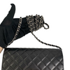The Chanel Quilted Wallet on Chain is the perfect complement to your outfit. It is crafted of luxuriously soft diamond quilted calfskin leather in black and a Chanel classic leather-threaded silver chain-link shoulder strap.