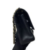 This gorgeous Chanel Double Flap Caviar Medium in Black features a woven strap, an exterior back slip pocket, and gold-tone hardware. It has a double flap and frontal gold CC turn-lock closure.