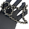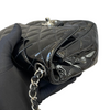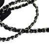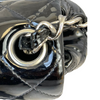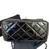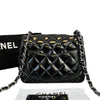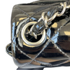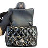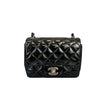 The Chanel Mini Square Classic Flap bag features a quilted patent leather body, a leather woven chain strap, a front flap with interlocking Cs and a twist lock closure, and an interior zip and slip pockets.