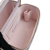 The Chanel Caviar CC Chain Vanity Case is made of textured caviar leather in a cult favorite light pink shade. The top opens to a pink interior with a mirror on the flap, the protective sticker is still attached to the mirror.