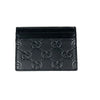 This Gucci cardholder is imprinted with Gucci monogram print on black leather. It has 4 card slots and one middle slot.