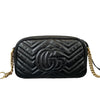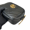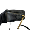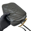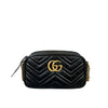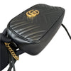 The Marmont Camera Bag bag features a quilted leather body, a gold toned chain strap, and a top zip closure.