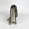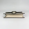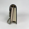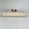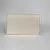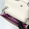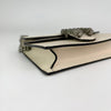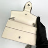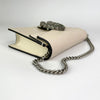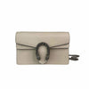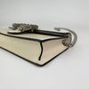 The Gucci Super Mini Dionysus Leather Crossbody Bag in White features a leather body, an ruthenium chain strap, and a front flap with a snap button closure.
