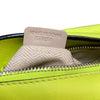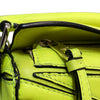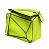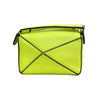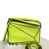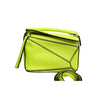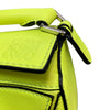 This is an authentic Loewe Puzzle Bag Mini Calfskin in Yellow. This elegant bag is made from textured calfskin leather. It features a rolled leather handle, an optional shoulder strap with polished silver hardware, and a top zipper that opens to a beige fabric interior.