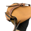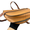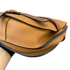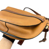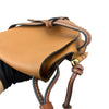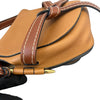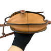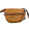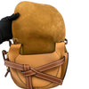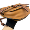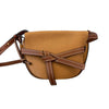 This is an authentic Loewe Small Gate Crossbody Grained Calfskin in Brown. The stylish crossbody is made of textured calfskin leather. The bag features a shoulder strap, a front knotted detail securing the flap, and gold hardware for an elegant touch. The flap opens up to a beige suede interior with a small patch pocket.