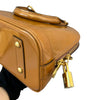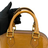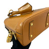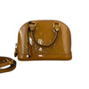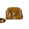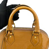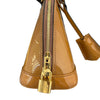This is an authentic Louis Vuitton Vernis Alma PM Monogram in Caramel. This handbag is crafted of signature Louis Vuitton monogram embossed vernis patent leather with gold hardware and a zip top closure. The bag opens to a fabric interior with pockets.