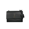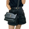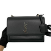 This Yves Saint Laurent Medium Sunset Bag in black is a timelessly elegant style that will transcend seasons and pair beautifully with any ensemble. Crafted from grained calfskin leather, this luxurious design features a classic, structured shape with a spacious interior and a clip on thick leather strap that can be worn cross-body. A leather-encased key ring and the YSL monogram accent create a signature heritage aesthetic.