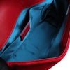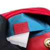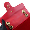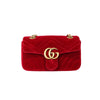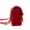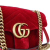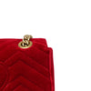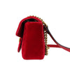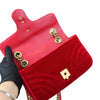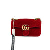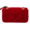The Mini Gucci GG Marmont red bag. has a softly structured shape and a flap closure with Double G hardware. The sliding chain strap can be worn multiple ways, changing between a shoulder and a top handle bag. Made in matelassé velvet with a heart on the back.