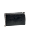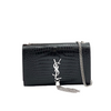 This Classic Monogram Kate Tassel Satchel from Saint Laurent is a stunning piece made from croc embossed calfskin leather in black. It has a silver chain link crossbody shoulder strap and a flap with a signature YSL logo and magnetic closure. The interior is made of black fabric lining with a patch pocket.