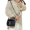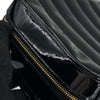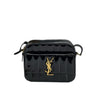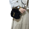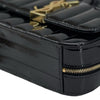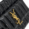 The Saint Laurent belt bag features a raised signature YSL gold plaque on a quilted square leather quilted body, a frontal flat pocket, and a thin leather strap.
