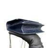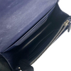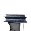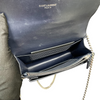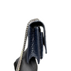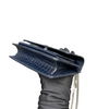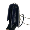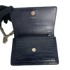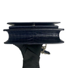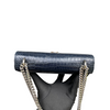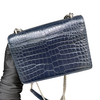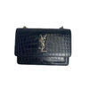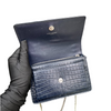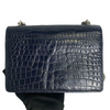 This chic Saint Laurent Sunset Mini Bag is made of blue croc embossed calfskin leather with accordion sides and has a chain and leather strap that can be worn crossbody or doubled on the shoulder, making it a stylish versatile fashion accessory.