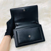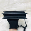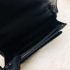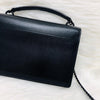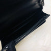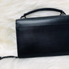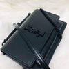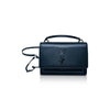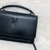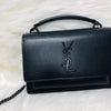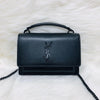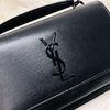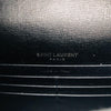 This chic Saint Laurent Flap Front Sunset Monogram Bag is made of 100% calfskin leather and has a padded top handle with rings. It features a black chain strap and leather shoulder pad that can be worn crossbody or doubled on the shoulder, making it a stylish versatile fashion accessory. The bag also has a leather-encased key ring and metal interlocking YSL signature on the front flap with black metal hardware.