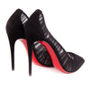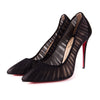 Draped in seductive ruched chiffon over mesh, these 100mm pumps keep you on trend with their translucent coverage. Louboutin`s classic aesthetic is present in the pointed toe silhouette, slim 100mm stiletto heel, and of course a bold red sole. Wear yours with a classic LBD for a perfect evening look.