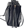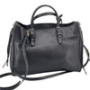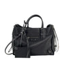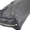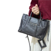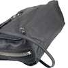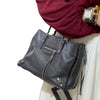 The MIni Papier A4 bag features a leather body, an exterior front zip pocket, rolled leather handles, a detachable flat strap, an open top, and an interior zip pocket.