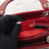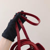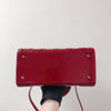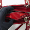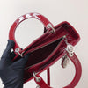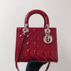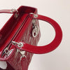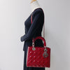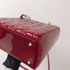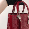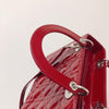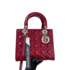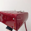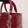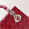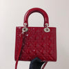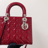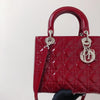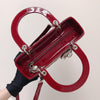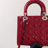 A sleek, feminine style from the line of Dior's iconic bag, the Medium LADY DIOR features the hallmark soft geometric quilted patent leather topstitched with the iconic Cannage in red. The silver signature D.I.O.R. metal jewelry charms embellish it with feminine elegance and the sturdy top handles with a long detachable chain make it versatile.