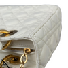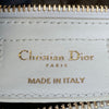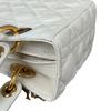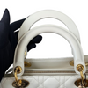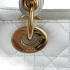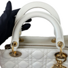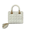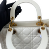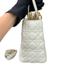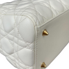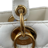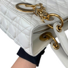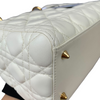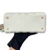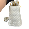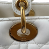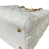 Cannage Lady Dior Medium in a rare creamy white accented with gold toned hardware. The Lady Dior features a quilted leather body, flat top handles, a detachable flat leather strap, a top zip closure, and an interior zip pocket.