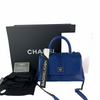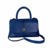 This Chanel Python Coco Handle Flap with RHW is a unique and elegant piece! It features an exotic Python-leather exterior in blue, ruthenium hardware, a rear smile pocket, a leather top handle, a threaded chain link leather shoulder strap with a shoulder pad, and the signature Chanel CC turn lock closure.