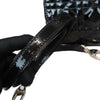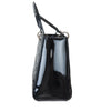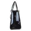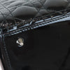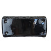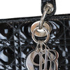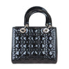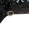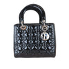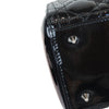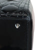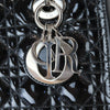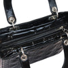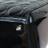 This is an authentic Christian Dior Lady Dior Medium Patent Cannage in Black. A stylish black tote bag made from geometric quilted patent leather. It boasts sturdy top handles, silver hardware, and Dior logo charms. The top zipper reveals a black Dior monogram jacquard fabric interior with a convenient zipper pocket.