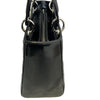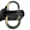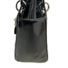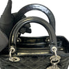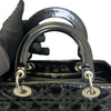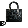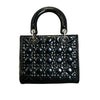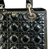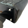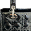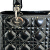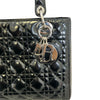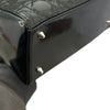This is an authentic Christian Dior Lady Dior Medium Patent Cannage in Black. A chic black tote bag crafted from geometric quilted patent leather features sturdy top handles, silver hardware, and Dior logo charms. The top zipper opens to reveal a black Dior monogram jacquard fabric interior with a convenient zipper pocket.