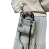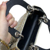 An elegant and modern take on the Mini Lady Dior. This stunning piece is a lovely combination of gold and silver braided into a tweed pattern. The silver signature D.I.O.R. metal jewelry charms embellish it with feminine elegance and the sturdy top handles with a long detachable chain make it versatile.