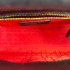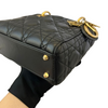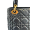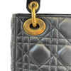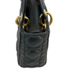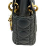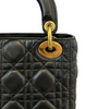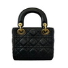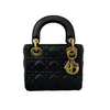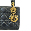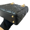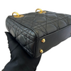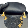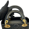 This is an authentic Christian Dior Mini Lady Dior Lambskin Cannage in Black. This small tote is made of black lambskin leather with an elegant geometric-quilted pattern. It comes with black leather handles, gold hardware, a Dior charm, and an optional strap. The interior features a red Dior logo jacquard lining and a handy zipper pocket.