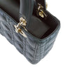 The Small My Lady Dior is a feminine, stylish tote crafted of the hallmark cannage quilted lambskin leather in dark green. The rolled reinforced leather handles provide sturdy carrying, while the embellished strap adds versatility and comfort. The bag features a gold hardware and a top inner flap that opens to a classy interior in brown Dior monogram jacquard fabric with a zip pocket.