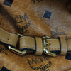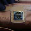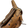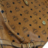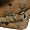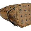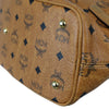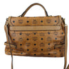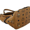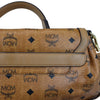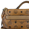 This is an authentic MCM Visetos Top Handle Satchel in Cognac. This elegant brown leather tote showcases a black MCM monogram overlay. It boasts a reinforced leather handle, an adjustable shoulder strap, a rear patched pocket, and gold hardware. The top reveals a brown monogram fabric interior with zipper and patch pockets.