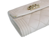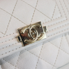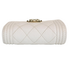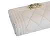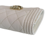This is an authentic Chanel Caviar Quilted Mini Boy Flap Wallet in White with Light Gold Hardware. This stylish wallet is crafted of diamond quilted caviar leather in white with a small faux aged gold CC hardware on the front flap. The wallet unsnaps to a coin pocket and trifold with card slots, patch pockets.