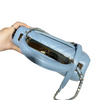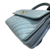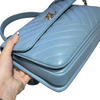 This Chanel Small Trendy CC Flap Lambskin Chevron Quilted in light blue is a rare find. It features a lambskin leather exterior, a leather top handle, and a chain and leather strap. This beauty can be worn as a top handle, or a shoulder bag.