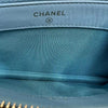 This is an authentic Chanel Wallet on Chain WOC Small Lambskin Quilted in Light Blue. This stylish wallet is crafted of lambskin leather in light blue. The bag features a gold leather threaded chain link cross-body strap and a gold Chanel CC logo. The bag features two top zippers that open to a matching interior with card slots.