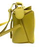 This is an authentic Loewe Puzzle Small Calfskin in Yellow. This elegant bag is made from textured calfskin leather. It features a rolled leather handle, a shoulder strap with gold hardware, and a top zipper that opens to a beige fabric interior.