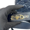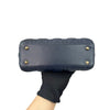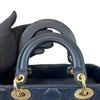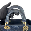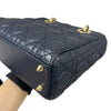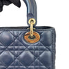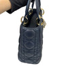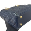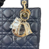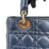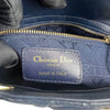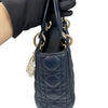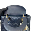 The Lucky Badges My Lady Dior is a feminine, stylish tote crafted of the hallmark cannage quilted lambskin leather in dark blue. The rolled reinforced leather handles provide sturdy carrying, while the embellished strap adds versatility and comfort. The bag features a light gold hardware and a top inner flap that opens to a classy interior in black Dior monogram jacquard fabric with a zip pocket.
