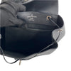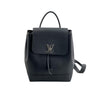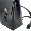 The Louis Vuitton Lockme backpack features a black calfskin leather body, a flat top handle, flat back straps, a top flap with a turn lock closure, drawstring closure, and an interior slip pocket.